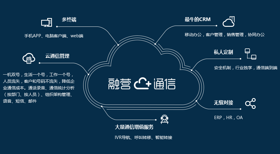 而融营通信在互联网时代中,紧抓市场机遇,与三大运营商进行合作,并在十年的通信服务研究下先后推出个各种创新的云通信产品。其产品如下:云电销、云电销系统、创业+(APP)、云通信开放平台。