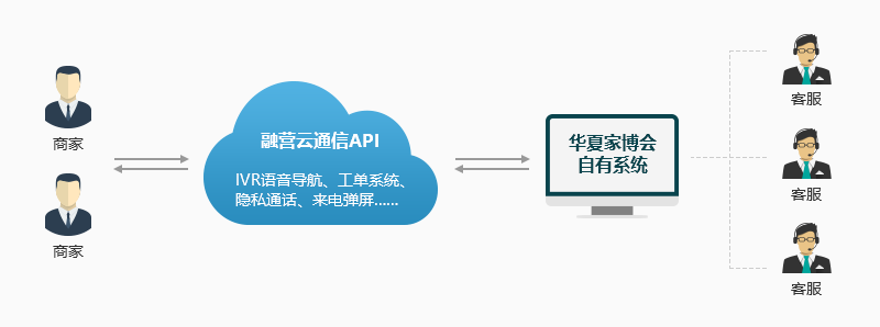 融营通信云通信平台与家博会自有的CRM业务系统做对接,将家博会CRM系统与云电销系统完美结合,无需任何硬件,电话线路接入云平台统一管理,使用期间有效帮助家博会解决了通话不稳定问题。在与商家沟通过程中节省了50%的时间!