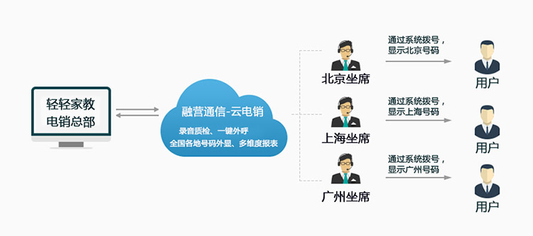 轻轻家教目前在全国多个城市都建立了分公司,招生期间就要发挥全国各分公司的营销力量,将营销能力扩展至业务末梢。通过融营云电销系统,低成本快速上线,即可实现一套平台统一管理全国业务。融营通信云电销提供全国固话资源,轻轻家教各地区分部通过平台系统拨打出去的号码均显示为本地号码,合规外显。用户信任感提高,接听率也高,提升本地服务体验。