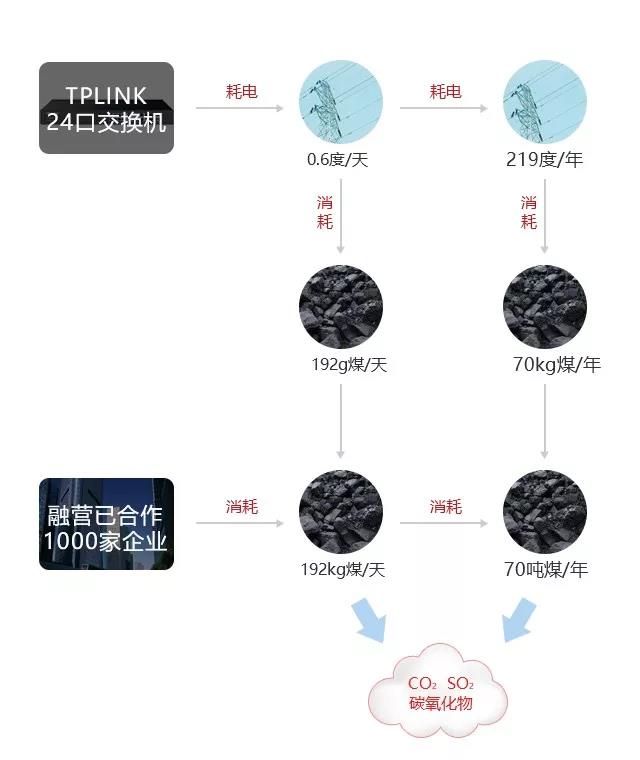 例如一个20多人的小微企业使用一个tp-link24口交换机每天需要耗电0.6度电,一年就需要电量219度,每天平均发一度电就需要320克的煤,那么一个20多人的企业则每年释放70.80kg的煤,同时公司每年会产生1.85公斤的二氧化碳和0.7公斤的二氧化硫和0.53公斤的碳氧化物,将对中国生态环境构成严重的威胁!