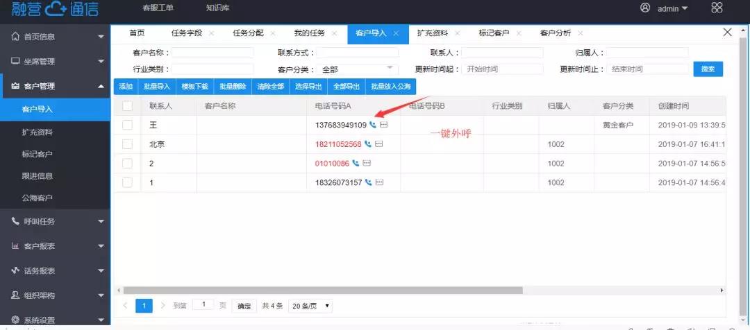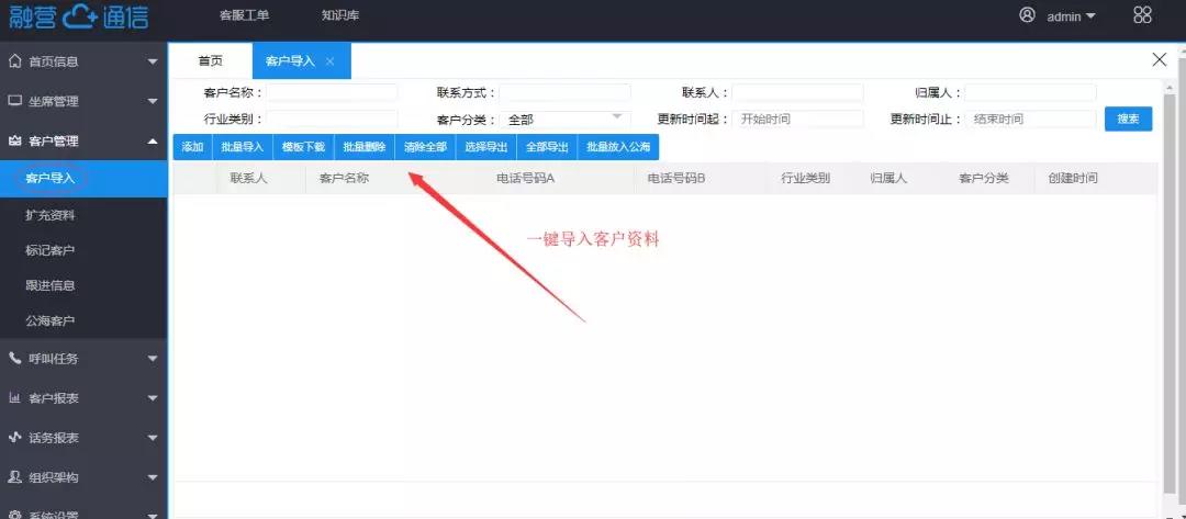 融营电销系统一个无需新增硬件设备即可通过pc端和移动端实现通话的解决方案,针对企业员工手动整理客户的信息效率低,在我们的呼叫系统中可以支持excel表一键导入客户的资料,并且可以一次性清理客户信息以及有选择性的导入和导出。
