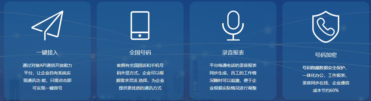 融营通信与中国移动、中国联通、中国电信三大运营商的紧密合作,快速成为行业中领先的集通信资源,saas产品平台,通信赋能paas为一体的综合云通信服务商,为企业和开发者提供通话、短信、会议、电销系统、IM、流量等通讯服务和不同场景下的行业云通信解决方案