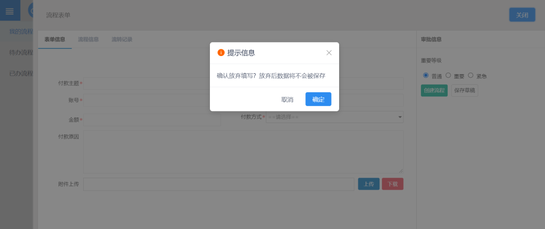 通过观察,融营通信技术团队发现部分使用者在发起流程任务时容易产生误操作行为,为避免此番情况下导致的页面数据丢失, 此次更新增设【取消创建流程】环节的【确认取消】提示弹出框,让使用者对取消行为做出 二次人为判断,尽可能地避免因误取消所带来的重复操作,从而达到提升工作效率的目的。