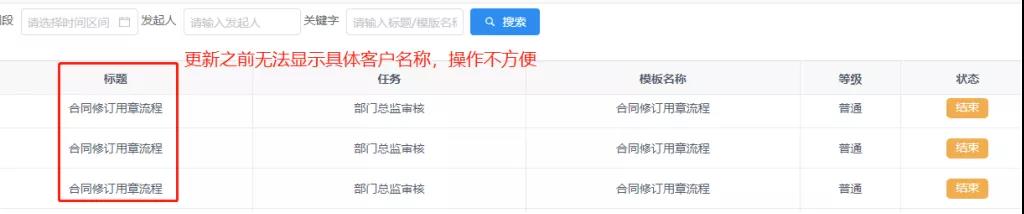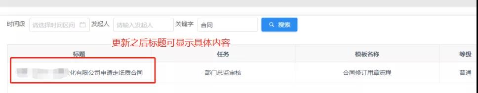 技术团队听取了大家的意见,在新版本的创业加BPM中,【合同修订】及【法务介入】流程的标题详情已支持全部显示,使用者不但可以直观预览标题的全部内容,还可在关键词检索栏中输入标题中的内容字段,精准搜查所需查找的流程事项。