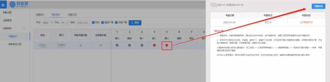 为了提高人事部门每月核对考勤数据的工作效率,创业加BPM新增考勤异常申诉入口,员工可通过点击【出勤报表】中带有“红色+号”的出勤时段来找到【考勤申诉】按钮, 并根据实际情况完成信息填写与流程审批,每个员工每月有两次申诉异常考勤的机会,顺利通过审批的异常考勤将会被自动更正为正常打卡。