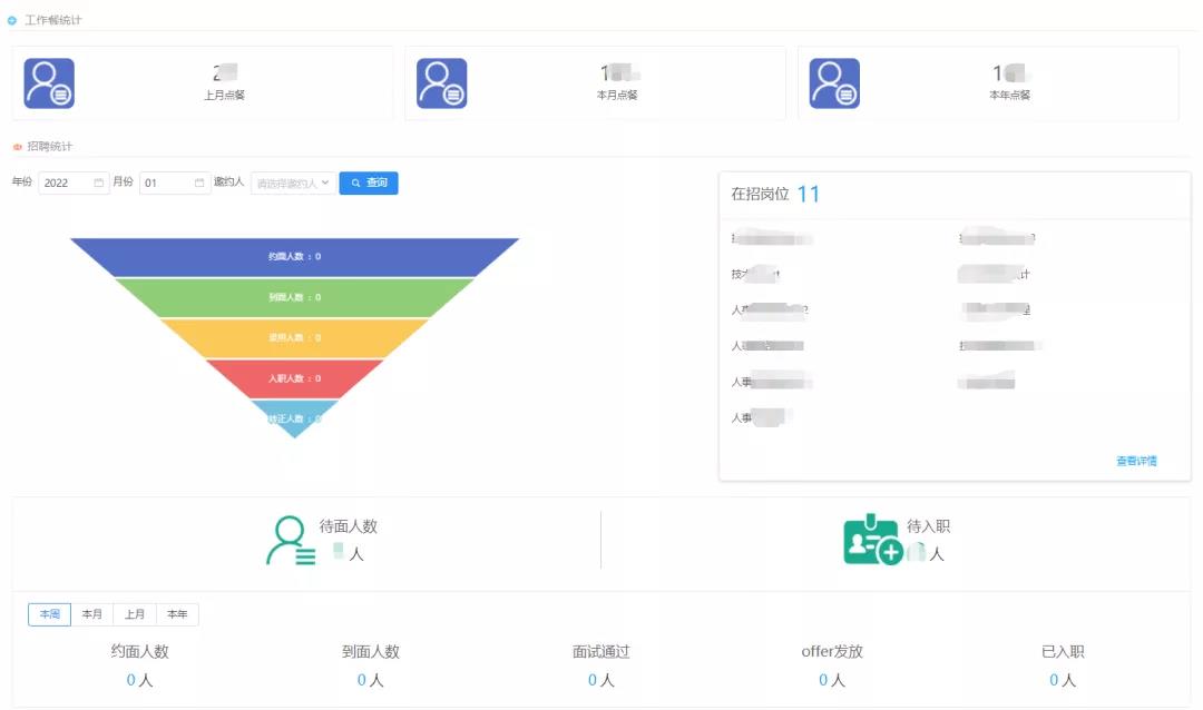 鉴于人事部门对于各类数据的统计与处理工作偏多,新版本的创业加BPM优化了HR首页的面板展示内容,新增了招聘数据统计、工作餐统计、面试数据统计等方面的内容直显。