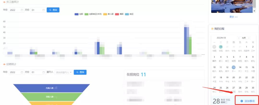 考虑到人事部门的工作维度较广,创业加BPM的人事首页已修改为备忘录形式,使用者可点击【添加事项】来新增每天的工作日程,以此起到及时提醒与事务整合的目的。